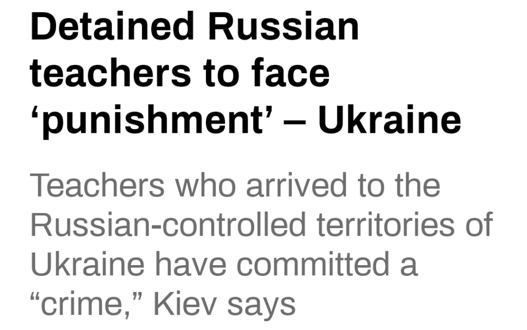 Nu framkommer det att de ukrainska styrkorna har fängslat ett okänt antal ryska lärare i Kharkov-regionen som undervisade lokala barn i enlighet med det ryska läroplansprogrammet. Dessa kommer nu att ställas inför rätta i Ukraina enligt vice premiärminister Irina Vereshchuk då ”de har begått ett brott mot nationen. Vice premiärministern anklagade de fängslade lärarna för att ägna sig åt ”olaglig verksamhet” utan att utveckla vilket specifikt brott de antas ha begått. Vereshchuk sade att de skulle kunna åtalas för ”brott mot krigets lagar” – en brottsanklagelse som vanligtvis används mot krigsförbrytare som är engagerade i tortyr, dödande av civila och plundring. Hon varnade också andra ryska medborgare som har anlänt till tillfälligt ockuperade ukrainska territorier för att de säkert skulle möta straff om de inte omedelbart lämnar ukrainskt territorium.