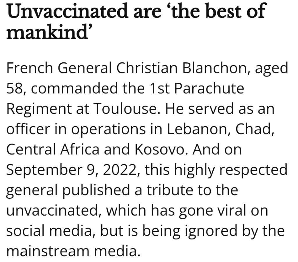 Den 58-årige franske generalen Christian Blanchon, befäl över 1:a fallskärmsregementet i Toulouse, som tjänstgjorde som officer i operationer i Libanon, Tchad, Centralafrika och Kosovo, publicerade den 9 september 2022 en fantastisk hyllning till alla ovaccinerade människor som stått emot såväl press som propaganda. Denna offentliga hyllning till de ovaccinerade har redan översatts till många språk, men ignoreras så klart av mainstreammedia.