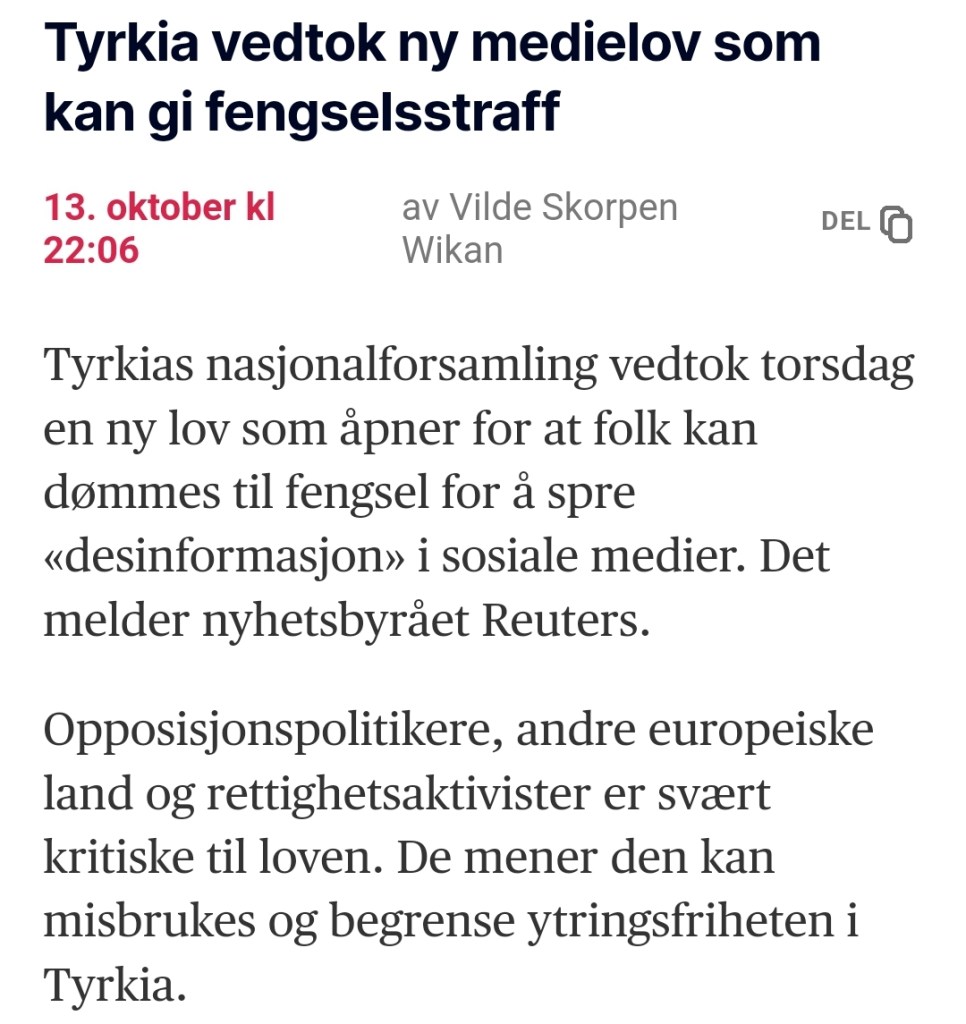 Det redan mycket odemokratiska Turkiet som sedan länge vänt ryggen åt mänskliga rättigheter med en mängd lagar mot regimkritiker, kan nu lägga ännu en till listan i och med att landets nationalförsamling i går antog en ny lag som öppnar för att människor kan dömas till fängelse för att sprida ”desinformation” i sociala medier. Såväl oppositionspolitiker som andra europeiska länder och rättsaktivister är mycket kritiska till lagen som begränsar yttrandefriheten i landet.