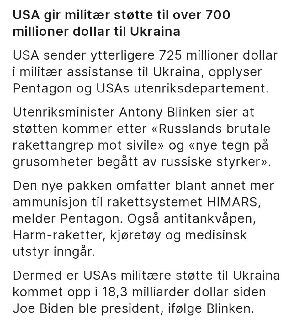 Det som förvånar mig mest är att inte fler reagerar på att just Ukraina får så ofantligt mycket pengar och vapen, medan andra länder i krig hamnat i skuggan trots stort lidande för befolkningen samt ingen skulle komma på tanken att finansiera endera parten. Jag tror faktiskt det saknar motstycke historiskt sett. Men eftersom det inte finns någon saklig diskussion, utan bara en konstant masspsykos skapad av media och västvärldens ledare så kan dårskapen fortgå och vi betalar medan det ukrainska folket får fortsätta drömma om fred i landet.