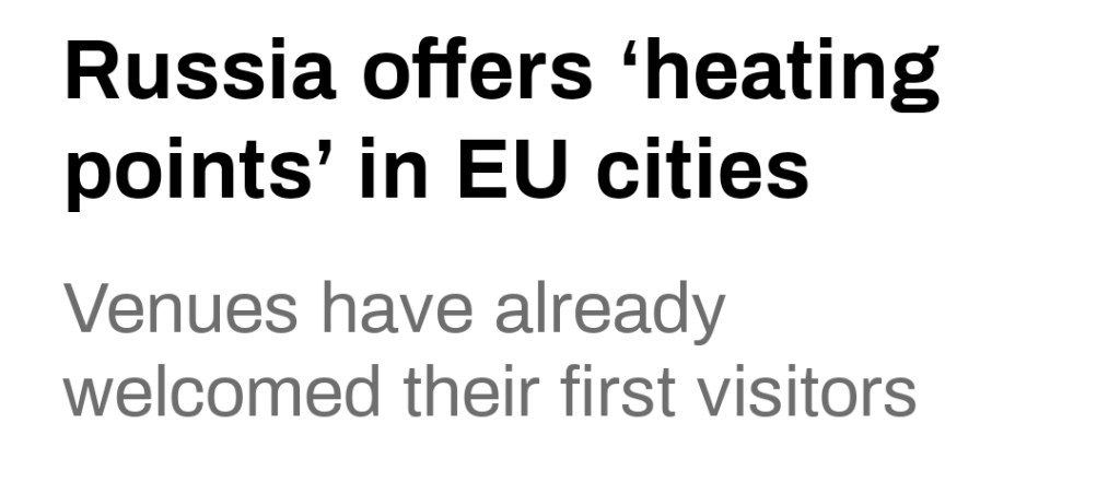 -”Européer, frys inte på grund av era dumma och onda ledare! Om dina barn är inlindade i jackor hemma och du har börjat spara rejält på el för att Ursula [von der Leyen], Olaf [Scholz] och Emmanuel [Macron] gav bort dina pengar till vapen åt de ukrainska nazisterna, kom och värm upp er i våra kulturcentra i era huvudstäder. Förutom att dricka te och njuta av filmer samt tecknade filmer, kommer besökare till de ryska husen också att kunna ladda sina telefoner och engagera sig i en massa intressanta saker som händer.”