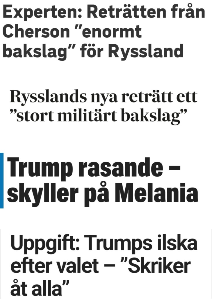 Svensk massmedia tycks ha gått bananas under natten och på morgonkvisten tornar rubriker upp sig om Rysslands nederlag i Ukraina och Trumps ilska över valförlusten i Mellanårsvalet. Att Trump inte ens ställde upp i valet, som för övrigt inte ens är avgjort ännu och att Rysslands eventuella tillbakadragande kan vara taktik, är så klart irrelevant i sammanhanget. Inte undra på att folk överlag har noll koll på vad som händer utanför Sveriges gränser när de dagligen marineras i propaganda från styrd statsmedia. #hjernevask