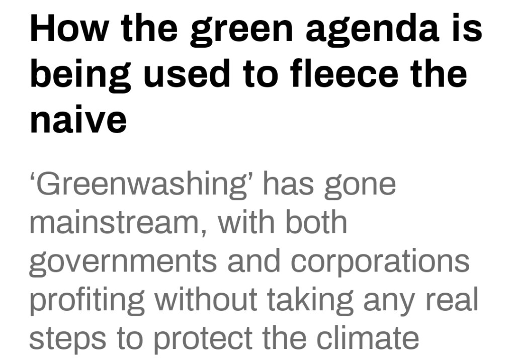 Kolumnisten och den politiska strategen Rachel Marsden har skrivit en artikel i ämnet Greenwashing med många poänger, som reflekterar över den galna klimathysterin samt den masspsykos som fortfarande råder och gör folk lättstyrda för att genomföra den politiska elitens dunkla agenda.