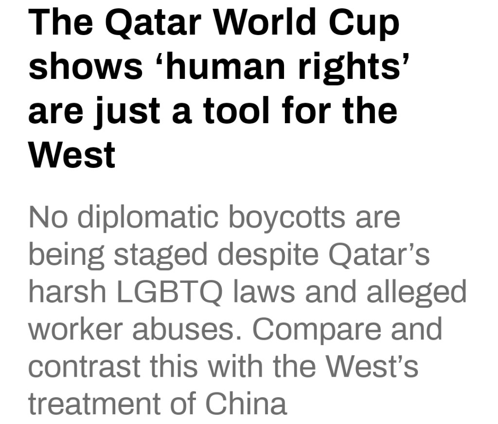 De som kritiserar Qatar befinner sig ensamma, utan resurser och ingen mediekampanj som skapar upprördhet. Därför är det största uttaget från detta alltså att ”mänskliga rättigheter” bara är ett spel, verktyg och vapen som används av västländer för att rättfärdiga samt legitimera påtvingandet av deras vilja på andra länder. De normer som väst säger sig upprätthålla tillämpas i själva verket inkonsekvent, opportunistiskt och selektivt. Annars är de helt nöjda med att vara tysta. Qatar bra, Kina dåligt.”
