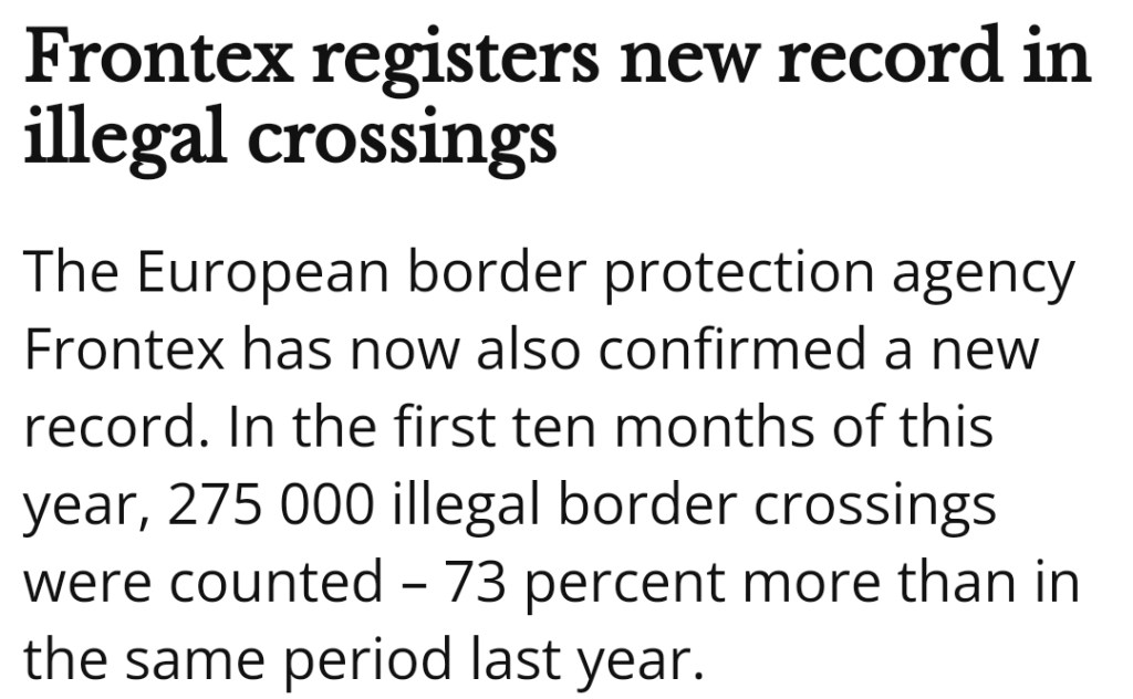 Den europeiska gränsskyddsmyndigheten Frontex har bekräftat ett nytt rekord vad gäller illegal migration till Europa. Under årets första tio månader räknades 275.000 illegala gränspasseringar, vilket är 73% fler än under samma period förra året.