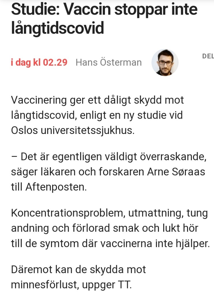 4. Jaa vartefter har effekter av detta lajvade virus dykt upp ofta oväntat….. går över till anekdot om Influensan där kom ibland efterräkningar typ trötthet, smakbortfall i många månader, osv På samma sätt kom ibland efterräkningar av andra åkommor, även barnsjukdomar. MEN detta lajvade virus har fått en otrolig uppmärksamhet….. ”Vaccinering ger ett dåligt skydd mot långtidscovid” jaa antar att LTC endast kommer efter att man infekterats annars är det som ”vittror” ett spöke som få sett… MEN varför skulle ett ”dåligt” vaccin öra skillnad? Vi vet ju att viruset har, tack vare massvaxandet, förändrats vartefter…. varför skulle inte även LTC påverkas?? WELL??? Sedan 3 år med pandemin har det dött typ 1% av de konstaterat smittade vad nu detta visar…. hur många har inte diagnosticerats? hur många har ”testat fel”, osv…. hur många av dessa 6 miljoner har haft underliggande sjukdomar? Gjorde en post där man INTE kan spåra en positiv effekt av vacciner däremot verkar en drop av jabbande vara positivt…. länken https://bjornwiklund.wordpress.com/2022/11/23/wow-4/