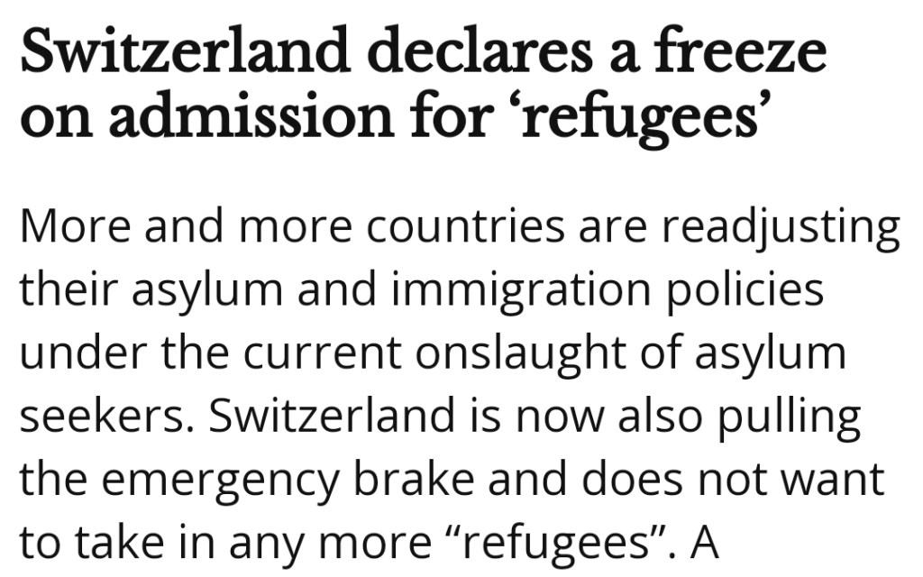 Sedan början av året har totalt 100.000 migranter ansökt om asyl i Schweiz, inklusive 70 000 krigsflyktingar från Ukraina. Sverige har liknande siffror med drygt 16.000 förstagångsansökningar jan-nov i år och drygt 26.000 förlängningsansökningar – exklusive de drygt 50.000 asylansökningarna från ukrainska flyktingar. Skillnaden är att vi inte lägger ribban på att ta emot beskedliga drygt 2.000 asylsökande per år.