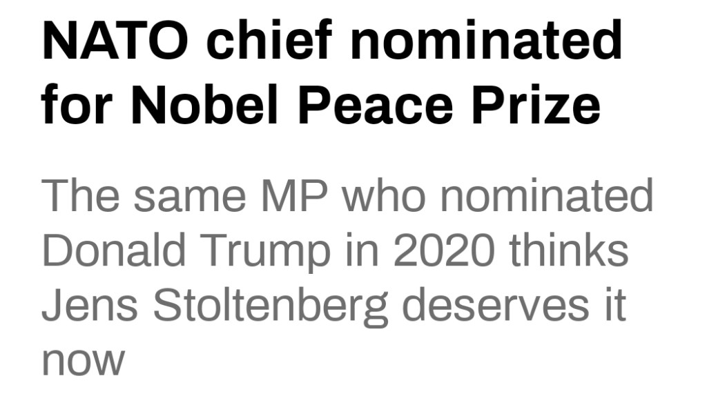 Hur den som varit med och utlöst kriget, otaliga gånger uppmanat västländerna att såväl skicka som producera mer vapen till Ukraina samt förra veckan deklarerade att fortsatt beväpning av Ukraina är den snabbaste vägen till fred överhuvudtaget kan nomineras till ett fredspris är helt klart en gåta.
