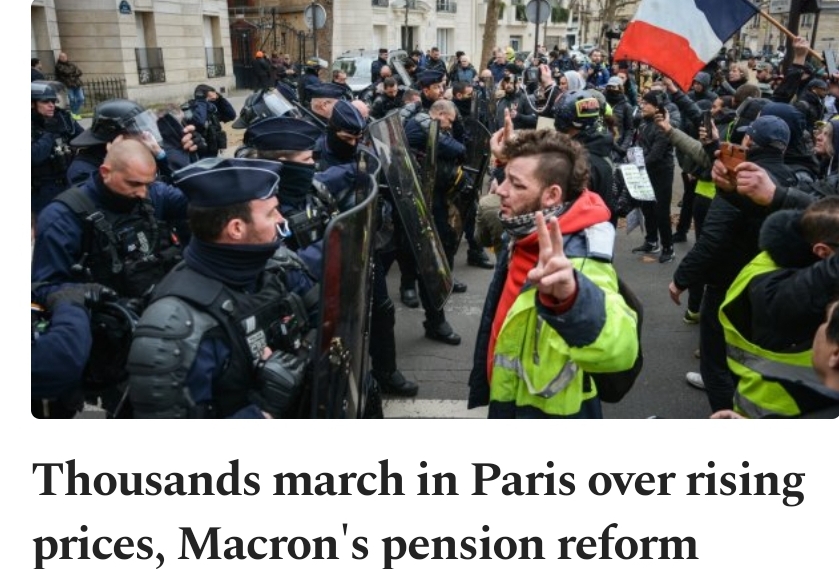 Demonstrationerna runt om i Europa mot höjda levnadskostnader avlöser varandra varje vecka, även om massmedia underlåter att rapportera om det för att invagga de naiva svenskarna i tron att allt är som det ska och att våra beslutsfattare går folkets ärenden. I går var det tusentals fransmän som tågade på gatorna i protest mot höga priser samt Macrons pensionsreform.