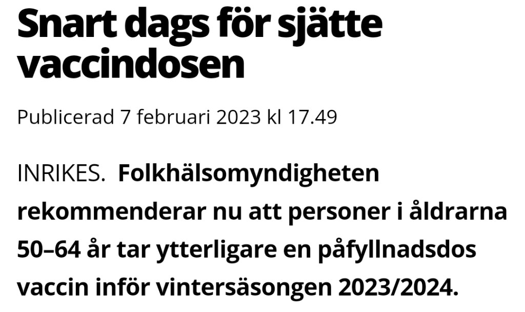 Man ska till varje pris fortsätta fördärva människors immunförsvar och Folkhälsomyndigheten rekommenderar i beslut från den 1 mars en påfyllnadsdos inför vintersäsongen 2023/2024 för personer i åldrarna 50–64 år, vilken man bedömer gör störst nytta om den tas under hösten eller till vintern då det sannolikt är störst risk för omfattande smittspridning.