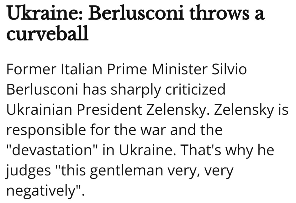 Den tidigare italienska premiärministern och nuvarande ledaren för partiet Forza Italia, Silvio Berlusconi, uttryckte sig i går i skarpa ordalag mot Ukraina och i synnerhet mot president Volodymyr Zelenskyj i ett tal där han bland annat framförde krav på avtal om vapenvila i Ukraina.