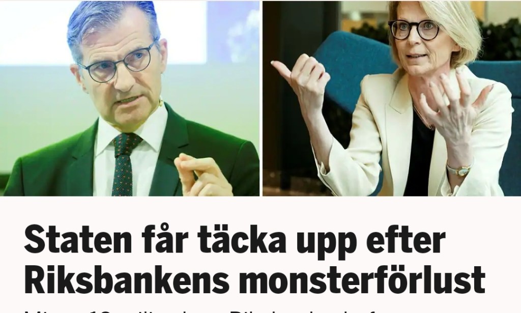 Riksbanken gjorde förra året en förlust på 80,7 miljarder kronor och det egna kapitalet uppgår nu till -18 miljarder. Vem ska betala för den förlusten? Jo staten, dvs vi medborgare som behöver tillföra medel motsvarande cirka 1% av BNP.