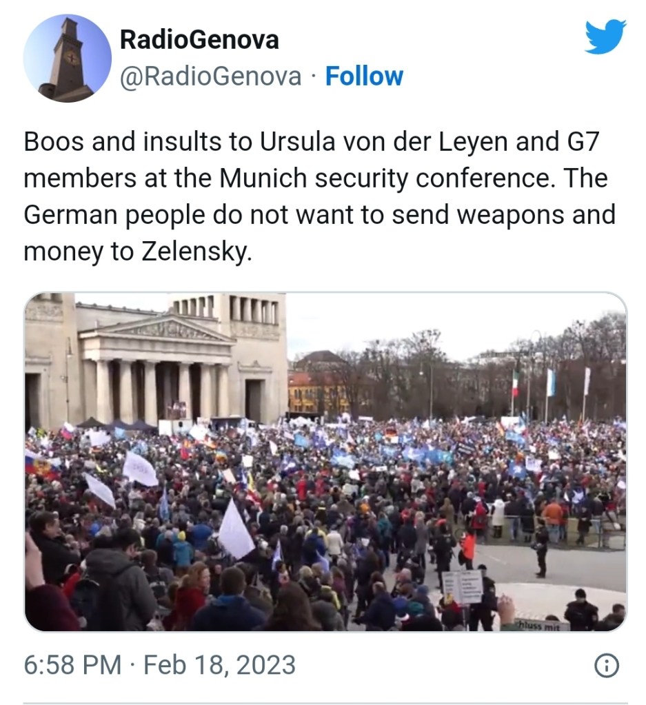 I skymundan av säkerhetskonferensen i München, skedde dessutom flera demonstrationer i lördags arrangerade av Munich Stand Up! med 20.000-25 000 deltagare med fredstecken och ryska flaggor som bland annat kritiserade Nato.