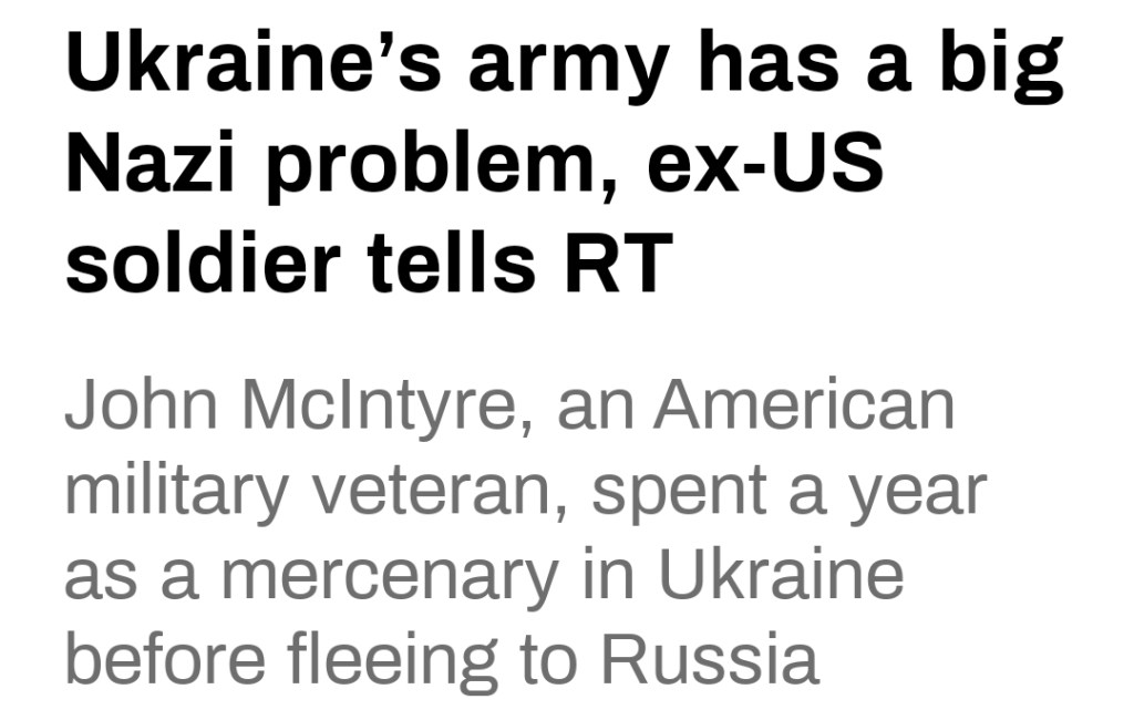 Intressant att ta del av intervju med den före detta amerikanska marinsoldaten John McIntyre, som tjänstgjorde som legosoldat i olika ukrainska militärenheter i nästan ett år och slår fast att nazistiskt inflytande i den ukrainska militären är närvarande överallt.
