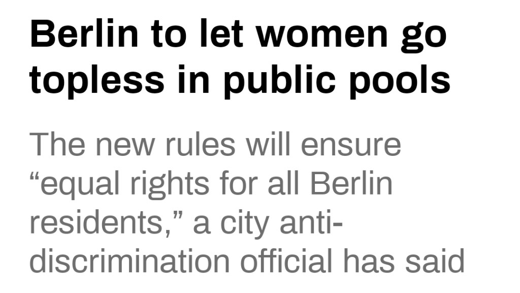 3 reaktioner till “Könsneutrala badregler i Berlins badhus – fritt fram för alla att bada topless