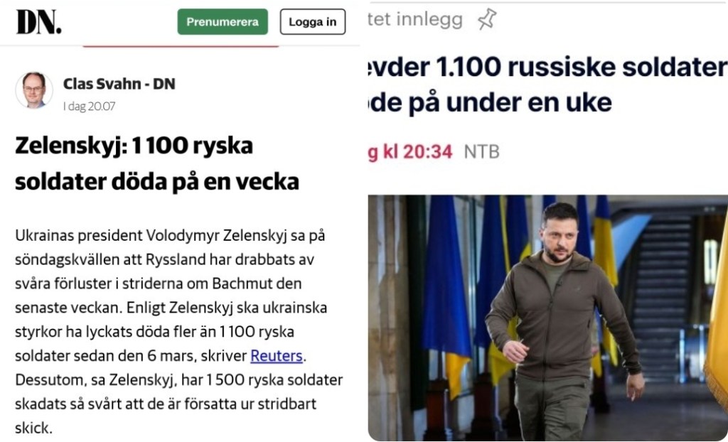 I vanlig ordning upprepar man allt som kommer från regimen Kiev som oemotsagd sanning och i exemplet får de svenska läsarna veta att president Zelensky i kväll basunerat ut att ryssarna drabbats av svåra förluster i Bachmut med över 1100 döda ryska soldater sedan den 6 mars. Som alltid nämns ingenting om hur stora förluster Ukraina drabbats av i form av såväl bakslag som döda soldater.