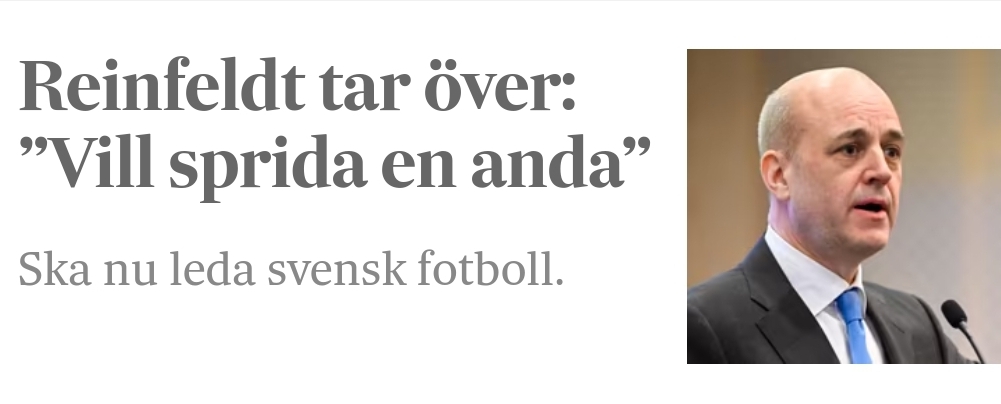 Få personer är så avskydda i Sverige som den före detta Centerpartiledaren Annie Lööf och den tidigare Moderatledaren samt tillika statsministern Fredrik Reinfeldt. Noterar att den sistnämnda nu en tar över som ny ordförande i Svenska fotbollförbundet (SvFF) i och med att han vann omröstningen mot motkandidaten Lars-Christer Olsson med siffrorna 143–111, vilket är anmärkningsvärt då Reinfeldt från början framstod som chanslös då inget distrikt visat sitt stöd. Undrar hur många som kommer sluta se på svensk fotboll efter det här?! 😄