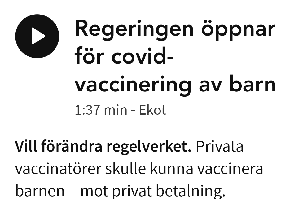 Socialminister Jakob Forssmeds besked i dag att regeringen planerar en förändring av regelverket för att göra det möjligt att låta privata vaccinatörer genomföra covidvaccinering av barn som föräldrarna själva får betala, låter därför väldigt ogenomtänkt.