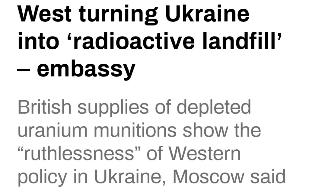 I en intervju med RT förra veckan varnade Rysslands sändebud till Storbritannien, ambassadör Andrey Kelin, för att DU-ammunition kommer att vara en fruktansvärd sak för jordbruket och för folket i Ukraina eftersom radioaktiva rester kan förorena landets vatten och mark i minst sex generationer.