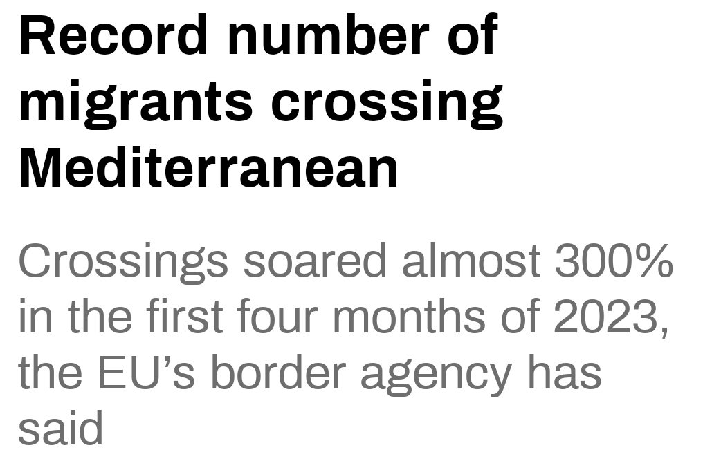 Enligt gränssäkerhetsbyrån Frontex har antalet illegala invandrare som tar den centrala Medelhavsvägen (från Libyen eller Tunisien till Italien eller Malta) in i EU ökat till rekordhöga 42.165 personer under enbart de första fyra månaderna i år, en ökning med 300% jämfört med samma period 2022 och anledningen sägs vara konkurrensen bland människohandlare som driver ner priset på överfarterna.