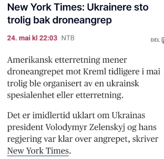 New York Times rapporterade i går att Ukrainas militär eller underrättelsetjänst sannolikt låg bakom drönarattacken den 3 maj i Moskva med hänvisning till anonyma amerikanska tjänstemän, där amerikanska underrättelsetjänster har bedömt detta delvis baserat på avlyssnad kommunikation från både ryska och ukrainska tjänstemän. Det är dock oklart vilken enhet som utförde attacken och huruvida Ukrainas president Zelensky var medveten om eller inblandad i attacken.