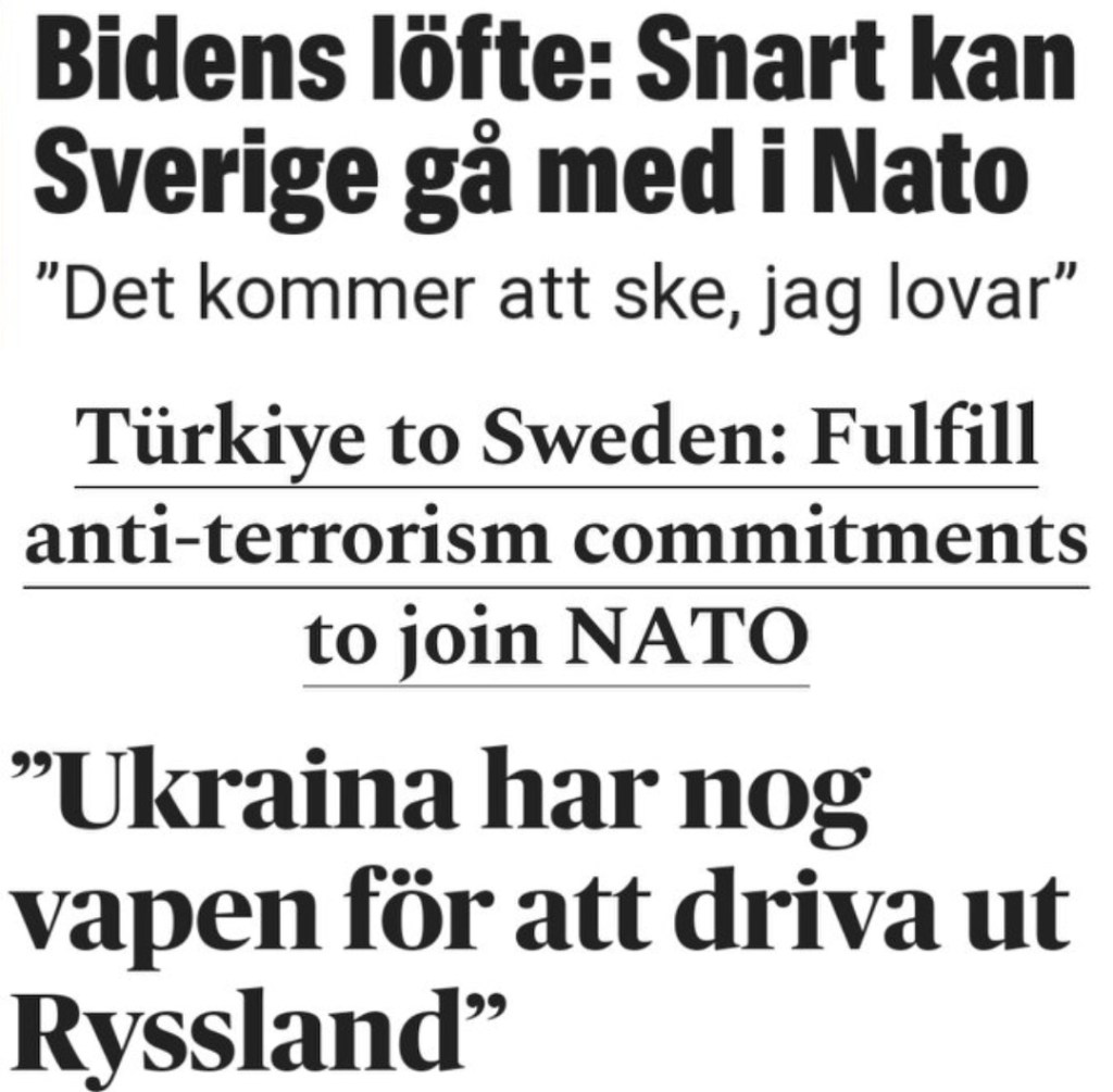 1. Nej Sverige kan förmodligen tolkas som ett meddelande till de som hanterar detta våra ”betters” jag har aldrig fått frågan…. ser att dessa synnerligen sparsamma undersökningar, mannen på gatan, Nisse i Hökarängen osv, För en debatt som har haft fog för sig i många decennier där tanken har varit alliansfrihet och neutralitet som svaret på frågan om position till andra länder…. och har en ändring ens kommit ifråga till omröstning i riksdagen…. Trots att vi fått Sovjetisk ubåt upp på torra land t.o.m. man kunde dessutom med stor sannolikhet avgöra att den var bestyckad med kärnvapen…. inget NATO då…. andra incidenter passerade genom det grovmaskiga nät vi hade. Osså plötsligen kommer detta… tillsammans med att det pågår ett motstånd, stopp, för att NATO skall expandera mer västerut….. kan inte vara tillfälligheter…. vad man än tycker om saken så att ”tyckare” i väst tycker att Ryssland med alla sina naturtillgångar skall delas i mindre bitar som var för sig skall inkluderas i nationer i väst….. well ett suveränt land skall delas i mindre bitar…. varför inte driva att USA med sina stater delas i 50 suveräna länder också som kan om de vill koppla sig till Ryssland, BRICS… Alaska t.ex till Ryssland Texas, Kalifornien et. al. till Mexico…. osv… för att behålla en multipolär värld…. Betänk att USA har en statsskuld på 10ggr Sveriges….