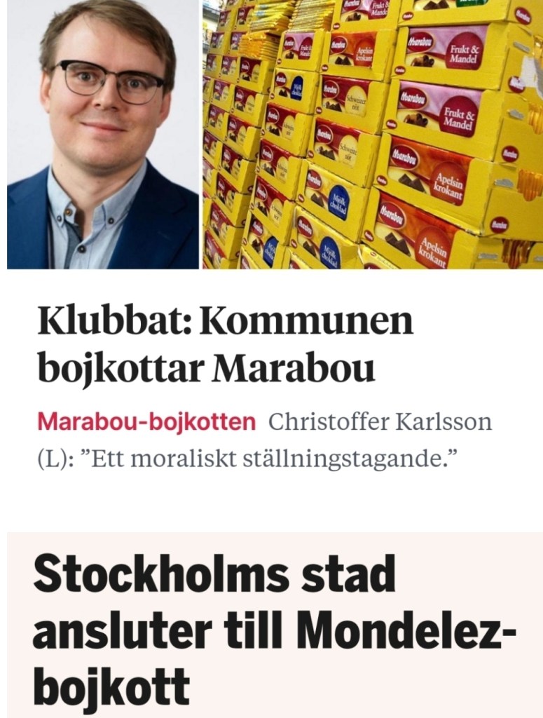 Den löjliga bojkotten av Marabou fortsätter och nu ansluter sig såväl Stockholms stad som Lunds kommun till Västra Götalandsregionens beslut att sluta köpa in varor från Mondelez.