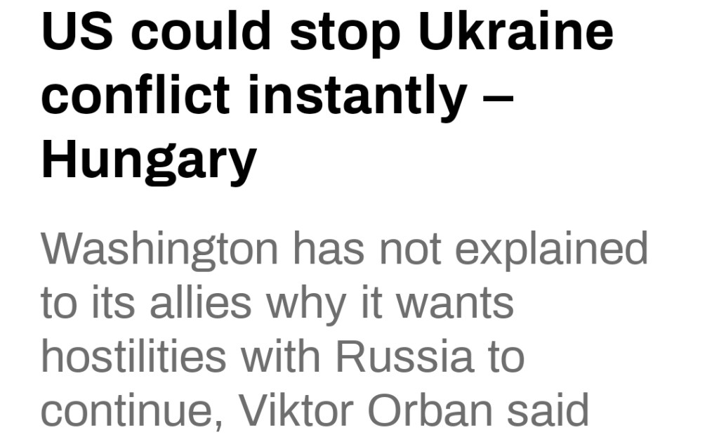 Som vanligt kloka ord från den ungerska ledaren och han har helt rätt i att kriget skulle kunna vara slut i morgon om det låg i Washingtons intresse och EU-länderna inklusive Sverige hade lätt kunnat säga stopp nu blir det varken mer vapenleveranser eller finansiellt stöd så hade man inte kunnat driva kriget vidare. Men eftersom såväl vårt land som EU styrs av vasaller och befolkningen är för indoktrinerade för att kunna protestera lär det så klart inte inträffa.