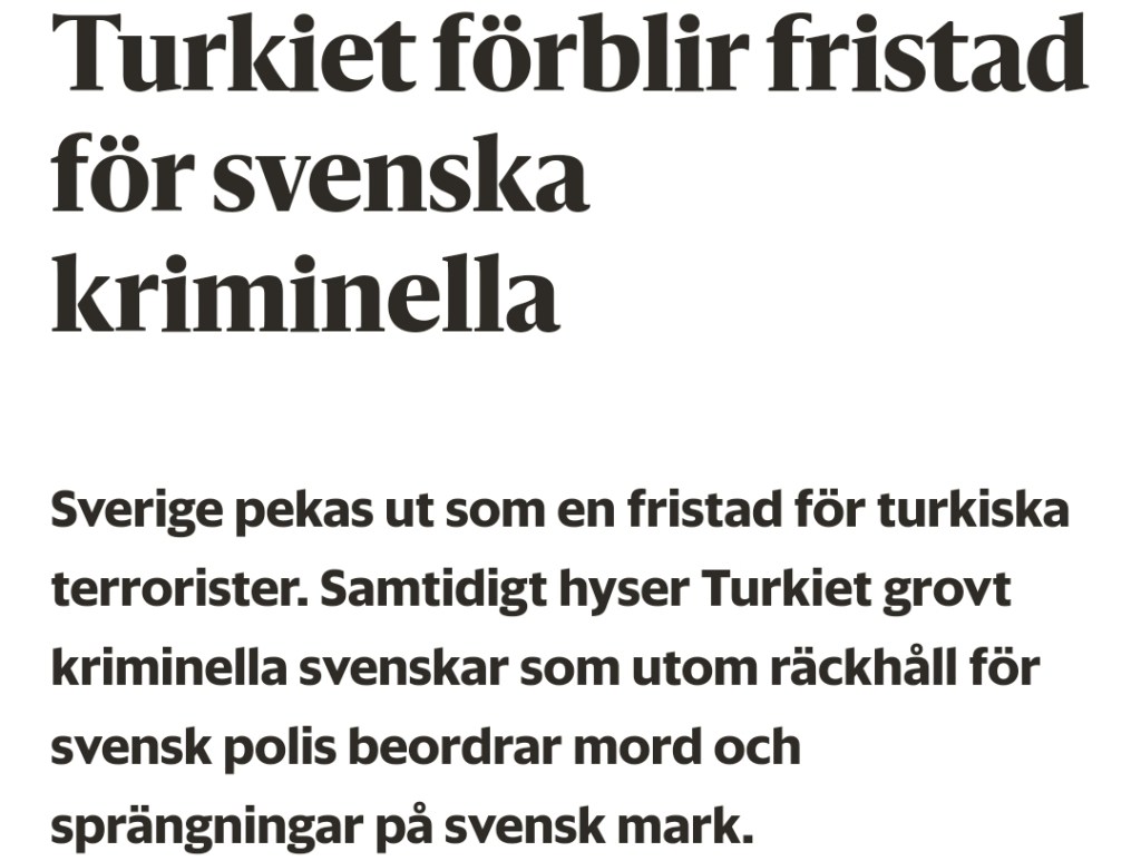 Samtidigt som Turkiets president Erdogan pekar ut Sverige som en vagga för terrorism och krävt att Sverige såväl lämnar ut 73 ”terrorister” som skärper sin lagstiftning, har misstänkta mördare och gängledare från Sverige fått en fristad i Turkiet där köpta medborgarskap gör att de inte utlämnas till Sverige samt utom räckhåll för svensk polis beordrar mord och sprängningar på svensk mark.