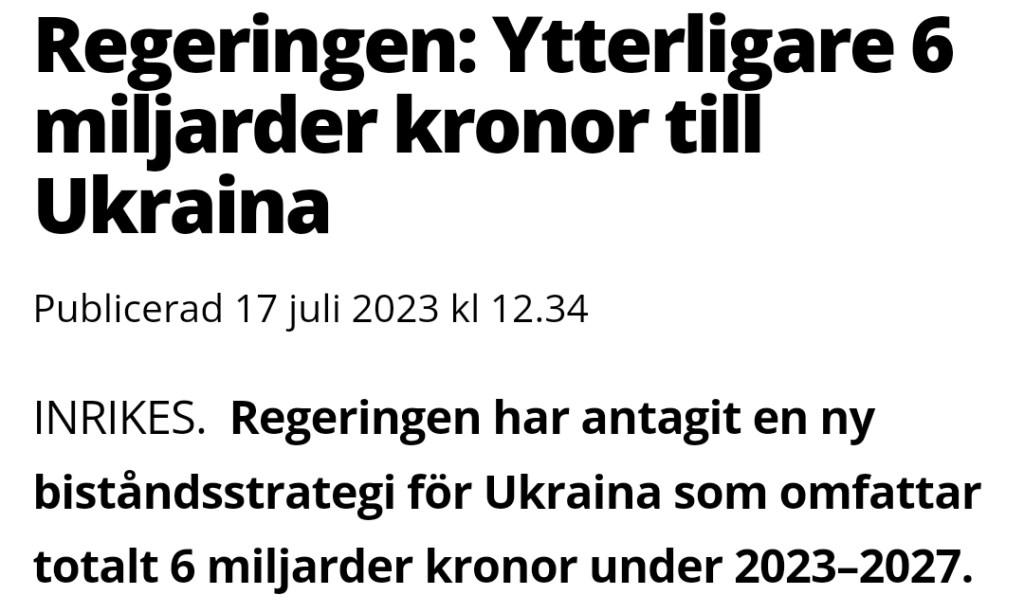 Samtidigt som landets skolor, vårdsektorn, barn/äldreomsorgen, infrastruktur m.m. blöder ymnigt eftersom det saknas pengar och otryggheten fortsätter plåga det kriminellt betyngda landet som en gång i tiden hade en välfärd att vara stolt över, meddelade regeringen i dag att man antagit en ny biståndsstrategi för Ukraina – regeringens viktigaste prioritering enligt biståndsminister Johan Forssell – som omfattar totalt 6 miljarder kronor under 2023–2027.