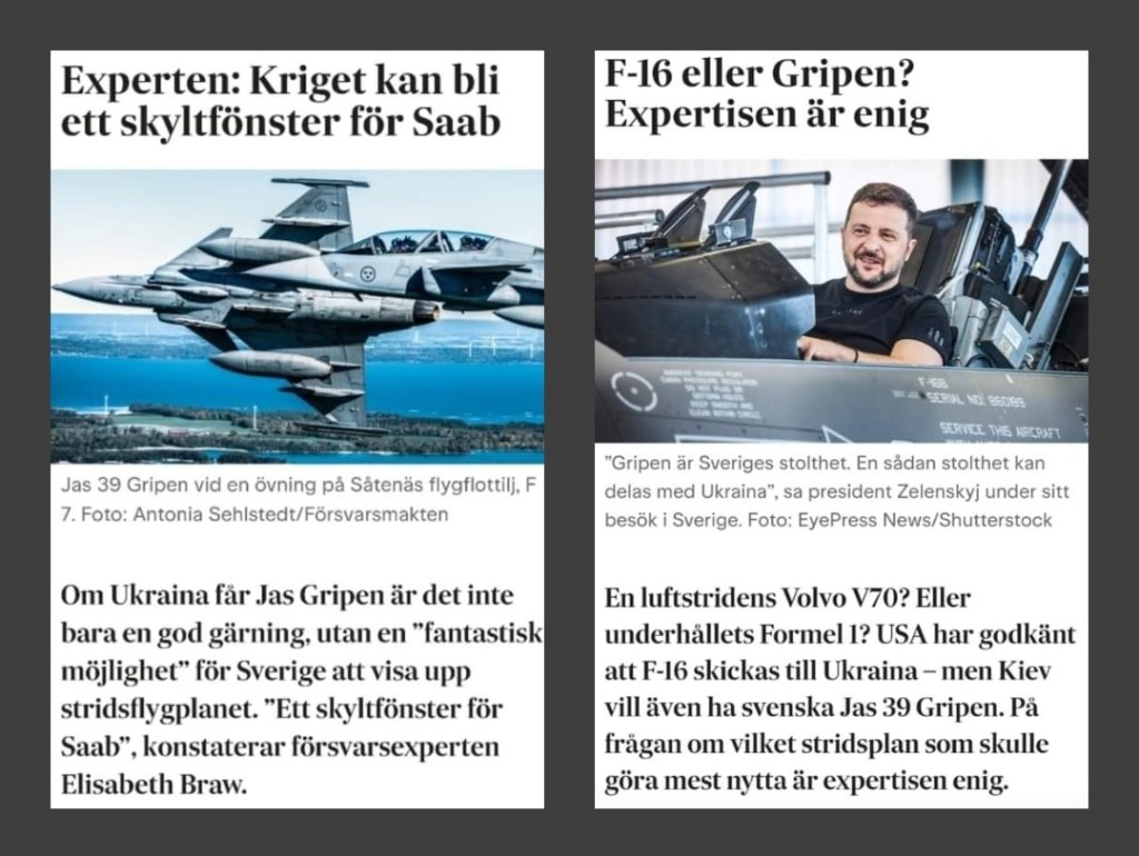 Dagens rubriker från SvD påvisar också hur man säljer in krig och fortsatt lidande till allmänheten genom att låta experter påskina att ”det är en god gärning” att skicka stridsflygplan och en ”fantastisk möjlighet” att visa upp JAS Gripen, som ett ”skyltfönster för Saab” när den svenska regeringen väl kommit till skott med det väntade beslutet att skicka Gripenplan till Zelensky.