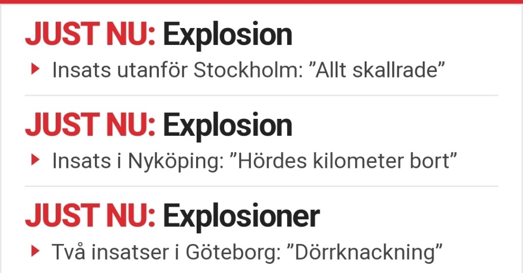 En vanlig torsdag morgon i Sverige anno 2023 är det normalt att se denna typ av rubriker, där bomber med enorma smällar som hörts på flera kilometers håll utlösts vid bostadshus på tre orter under natten. Denna gång i Stockholm, Nyköping och Göteborg – i morgon smäller det någon annanstans. Vi är väl härdade nu, eller?