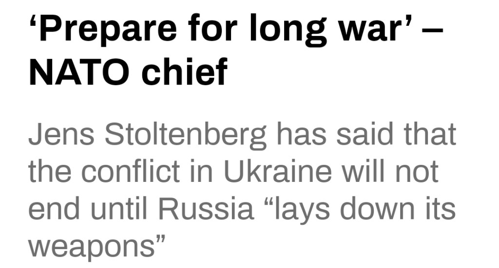 I en intervju med den tyska mediegruppen Funke, deklarerade Stoltenberg att väst måste förbereda sig för ett långt krig i Ukraina. Stoltenberg hävdade att trots att han vill ha en snabb fred i Ukraina, stödjer han ändå fortsatt Zelenskys mål om en militär seger över Ryssland.