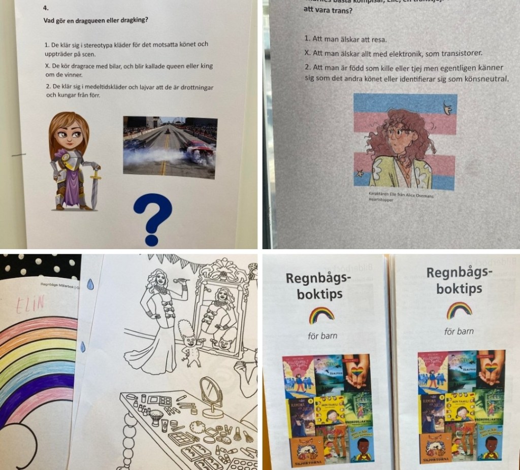Döm om förälderns förvåning när frågorna på tipspromenaden visade sig innehålla frågeställningar som exempelvis vad en drag queen respektive drag king ägnar sig åt samt vad det innebär att vara trans. Bilderna man skulle färglägga föreställde givetvis drags och så lite tips boktips med regnbågstema.