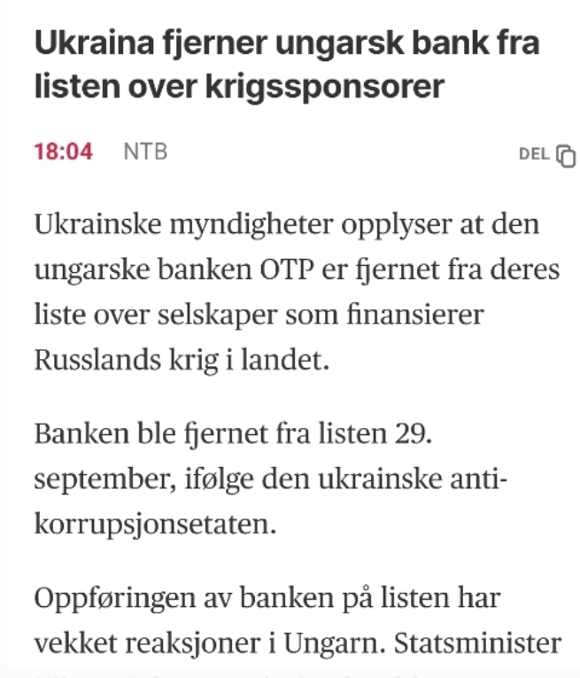 Ungerns försvarsminister Kristóf Szalay-Bobrovniczky sade för drygt en månad sedan att så länge Ukraina håller kvar Ungerns OTP-bank på sin lista över krigssponsorer så kommer Ungern inte att deltaga i några ytterligare förhandlingar angående den föreslagna finansiella ramen för Ukraina.