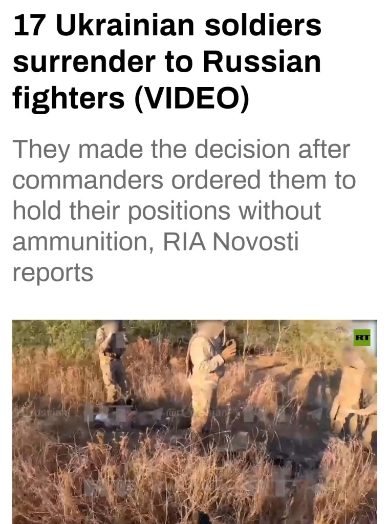 Som jag skrev om förra veckan är det många ukrainska soldater som väljer att kapitulera via en speciell radiofrekvens utformad för soldater som är villiga att lägga ner sina vapen eftersom de hotas att dödas av sina egna befäl om de inte strider till döds. En film från drönare som nu florerar på bland annat Telegram, visar hur 17 ukrainska soldater kapitulerar till ryska styrkor i Donetsk.
