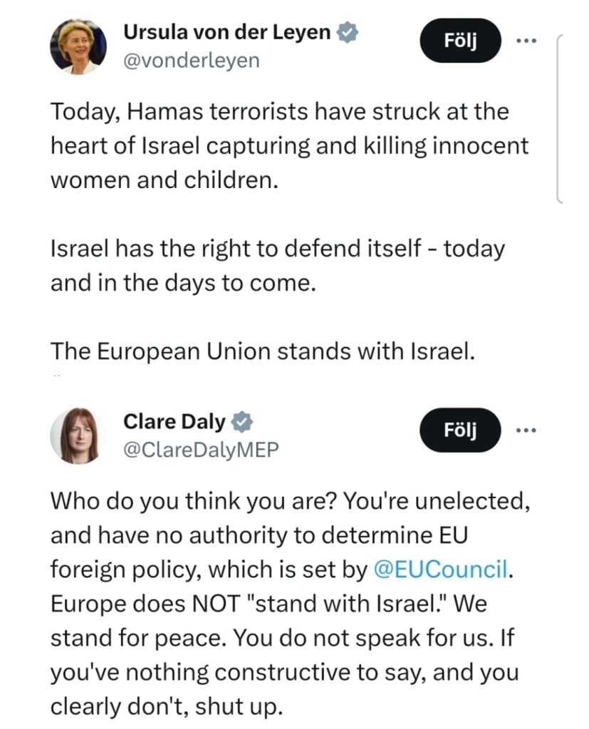 Ibland händer det, som när von der Leyen i söndags skrev på X att ”Israel har rätt att försvara sig – idag och i dagarna som kommer. Europeiska unionen står med Israel”, vilket fick den irländska parlamentsledamoten Clare Daly att rasa och skriva ”Vem tror du att du är? Du är ovald och har ingen befogenhet att bestämma EU:s utrikespolitik, vilket är fastställt av @EUCouncil. ”Europa står INTE med Israel. Vi står för fred. Du talar inte för oss. Om du inte har något konstruktivt att säga och det har du uppenbarligen inte, håll käften.”