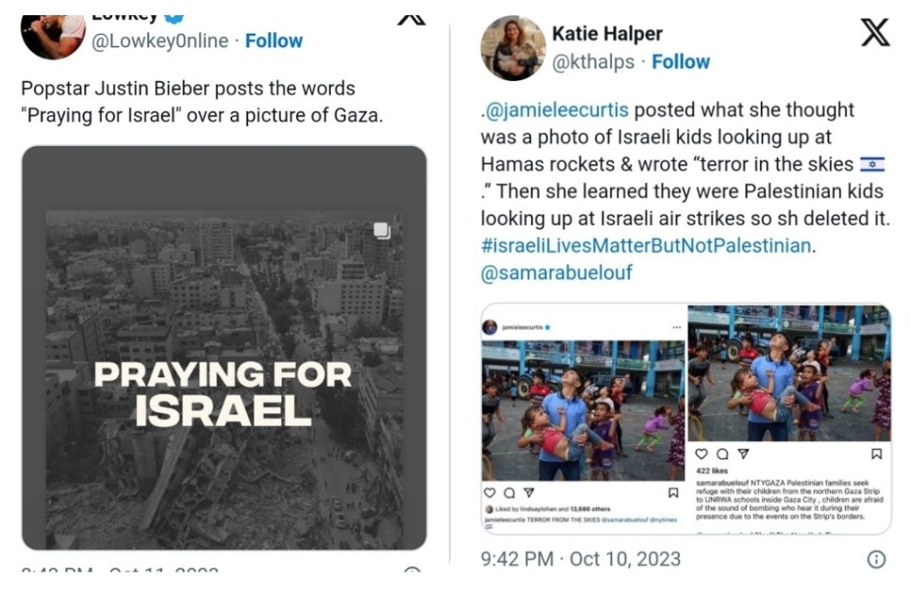Skådespelerskan Jamie Lee Curtis gjorde ett liknande misstag och delade en bild med rubriken ”terror from the skies, Israel” som hon senare raderade när det visade sig att barnen på bilden var palestinier i Gaza som tittade på ett inkommande israeliskt luftangrepp.
