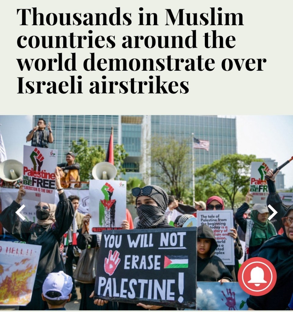 Missnöjet över Israels agerande i Gaza pyr runt om i världen och i går höll tusentals människor solidaritetsmanifestationer för Palestina i ett tiotal länder (Irak, Jordanien, Egypten, Turkiet, Indonesien, Malaysia, Marocko, Libanon, Jemen och Sydafrika) där man krävde ett stopp för Israels flygattacker och blockad av Gaza.