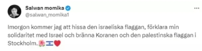 I en tid när Sverige redan ligger på shitlist i muslimska länder, noterar jag dessutom att den irakiske islamkritikern Salwan Momika, som tidigare deklarerat att han inte skulle bränna fler koraner, ånyo ska genomföra en manifestation i dag i centrala Stockholm där såväl den palestinska flaggan som koranen kommer att brännas samt den israeliska flaggan hissas i solidaritet med Israel.