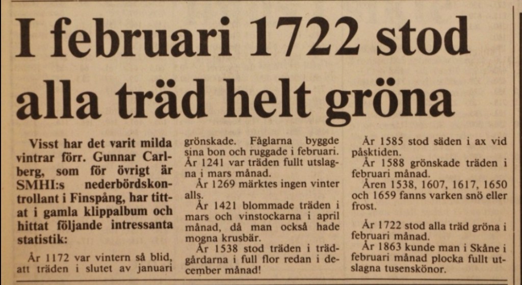 Märkligt att det förr i tiden var vanligt med milda vintrar i Sverige med grönskande träd och utslagna blommor redan i början av året utan att det fick människor eller styrande att reagera på ett extraordinärt sätt. Vad var det då som orsakade temperaturhöjningen?