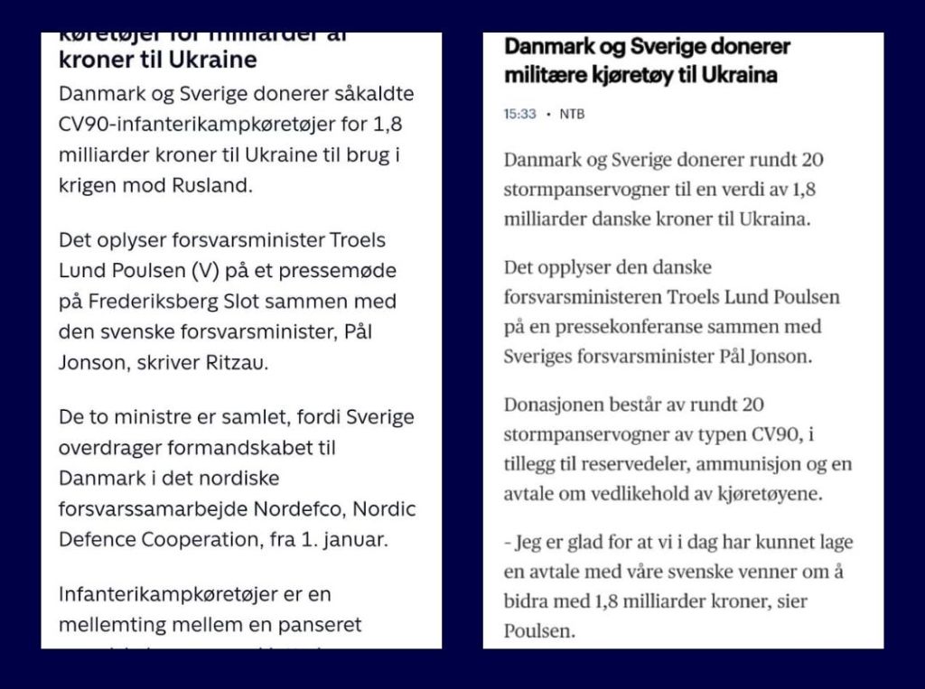 Den danska försvarsministern Troels Lund Poulsen (V) höll presskonferens på Frederiksberg slott tillsammans med Sveriges försvarsminister Pål Jonson, där man lät meddela att Danmark och Sverige skänker infanteristridsfordon värda 1,8 miljarder kronor till Ukraina. Det rör sig om ett 20-tal nyproducerade stormpansarfordon av typen CV90 – förutom reservdelar, ammunition och avtal om underhåll av fordonen. Sverige har redan tidigare donerat 50 CV90-fordon som ryssarna troligen roat sig med att skjuta sönder.
