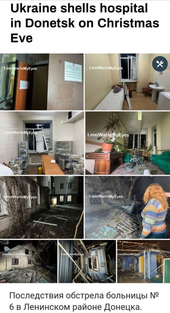 I går skedde nya attacker mot civila när ukrainska styrkor attackerade flera civila mål i Rysslands folkrepublik Donetsk (DPR) och bland annat skadade ett sjukhus enligt lokala myndigheter, där minst tre patienter skadades efter att en granat träffade det centrala kliniska sjukhuset nr 6 i Leninskydistriktet i Donetsk. Foton och videor från platsen visar efterdyningarna av explosionen på sjukhusavdelningarna.