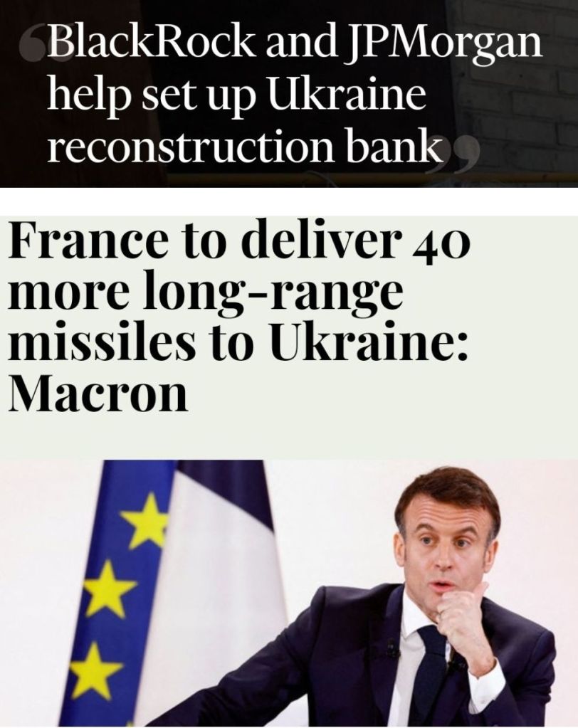 All förödelse som orsakats av att regimen i Kiev valt att prioritera västerländska intressen framför sitt eget folk genom att fortsätta proxykriget i Ukraina, kommer ta lång tid att återställa när kriget väl är över och kosta flera tusen miljarder kronor. Förutom att skattebetalarna i EU ska stå för notan genom våra beslutsfattares försorg, vill så klart även finansjättarna vara med och leka.