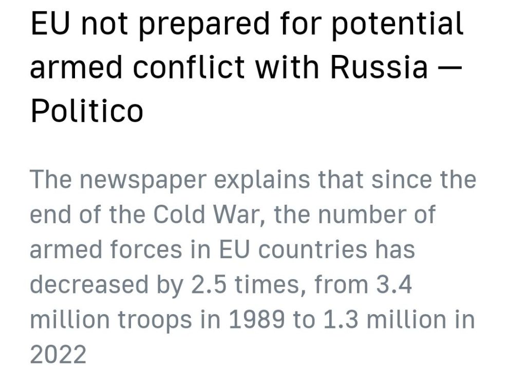 Faktum är att det inte bara är Sverige som har problem att försvara sig – det kaxiga EU, vars medlemsländer kastar ur sig det ena misslyckade sanktionspaketet efter det andra samtidigt som man skickat sin egen vapenarsenal till Ukraina, har inte heller den nödvändiga försvarspotentialen för att självständigt konfrontera Ryssland utan stöd från USA i händelse av en potentiell väpnad konflikt, vilket tidningen Politico konstaterade i en artikel häromdagen.