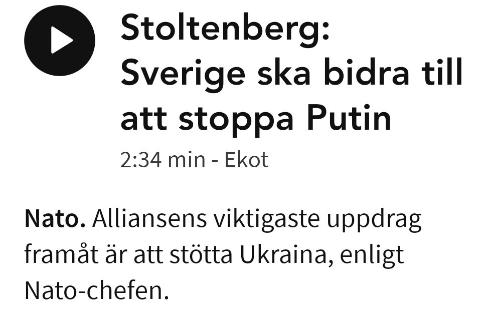 ”… och i dag bekräftade Natos generalsekreterare Jens Stoltenberg att Sveriges första uppgift som Natomedlem blir att bidraga till att hindra Putin från att vinna kriget i Ukraina.”