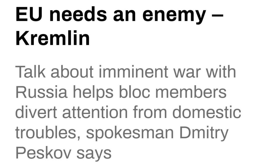 När Kremls talesperson Dmitrij Peskov talade med journalisten Pavel Zarubin tidigare i dag framförde han en viktig poäng, nämligen att EU-politiker använder hotet om ett krig mot Ryssland för att tjäna sina egna inhemska intressen och distrahera befolkningen från ländernas egna interna problem samt motivera fortsatt finansiering av Ukraina.
