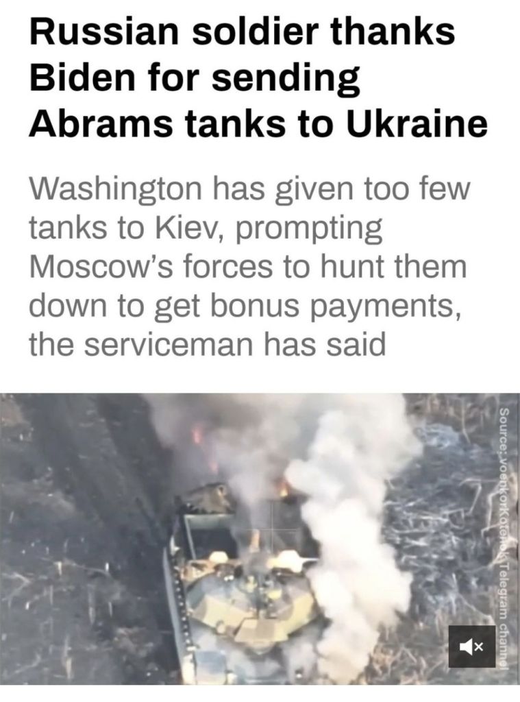 De ryska trupperna verkar dessutom erbjudas bonus för varje förstörd del av västerländsk utrustning och har spelat in en video, där en av soldaterna tackar USA:s president Joe Biden för att han försett Kiev med Abrams stridsvagnar och därigenom gav Moskvas styrkor en möjlighet att tjäna lite extra pengar genom att förstöra dem. Soldaten ber Biden att skicka fler Abrams-stridsvagnar, eftersom de som anlände till Ukraina är väldigt få och de ryska styrkorna måste spendera mycket tid på att bara leta upp dem.