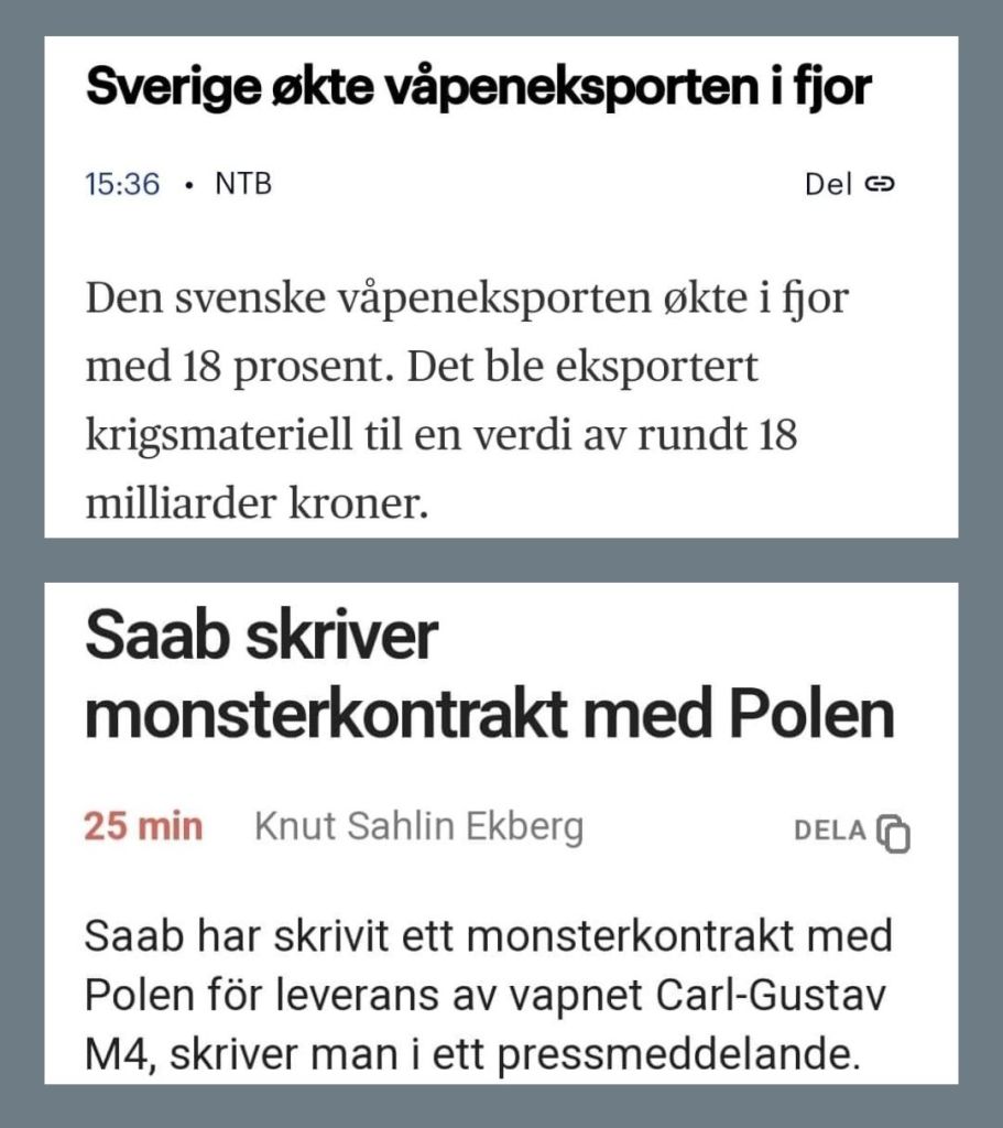Dessutom ser det oerhört ljust ut för den ”humanitära” stormakten som säger sig vara emot krig samt förespråka fred och demokrati, eftersom det försämrade säkerhetspolitiska läget samt den ständiga upprustningen i världen enligt ISP-direktören Carl Johan Wieslander gör att den svenska försvarsindustrin kan förväntas få order under lång tid framöver, där intresset för svensk krigsmateriel är stort – inte minst i Ukraina. 👍