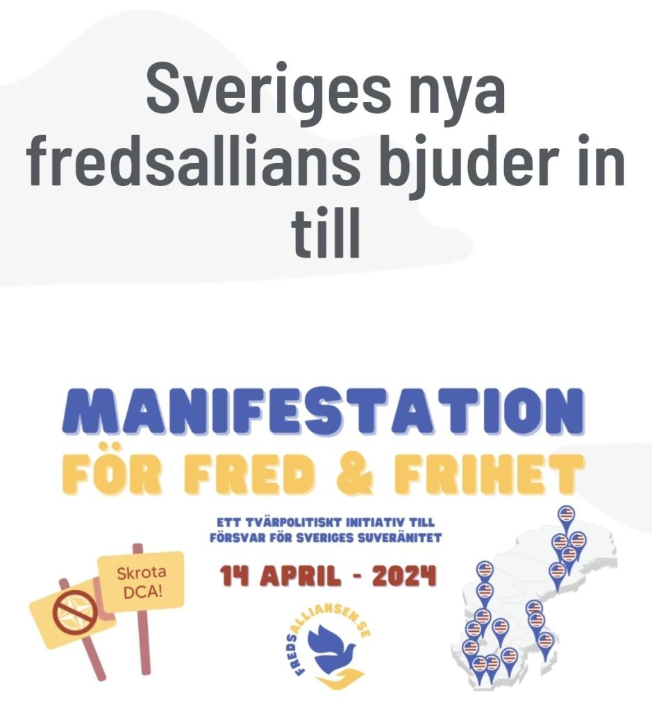 Den tvärpolitiska Fredsalliansen, vars syfte är att förena människor från höger till vänster för frihet och fredspolitik, bjuder in till manifestation i Stockholm för Sveriges suveränitet och mot det försvarssamarbetsavtal med USA som riksdagen röstar om den 8 maj.